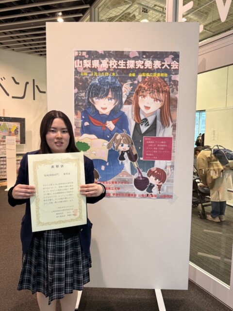 3月26日(木)に実施された「山梨県高校生探究発表会」のスライド発表部門(地域課題分野)において、本校1年生が出場し、部門第2位にあたる「優秀賞」を受賞しました。